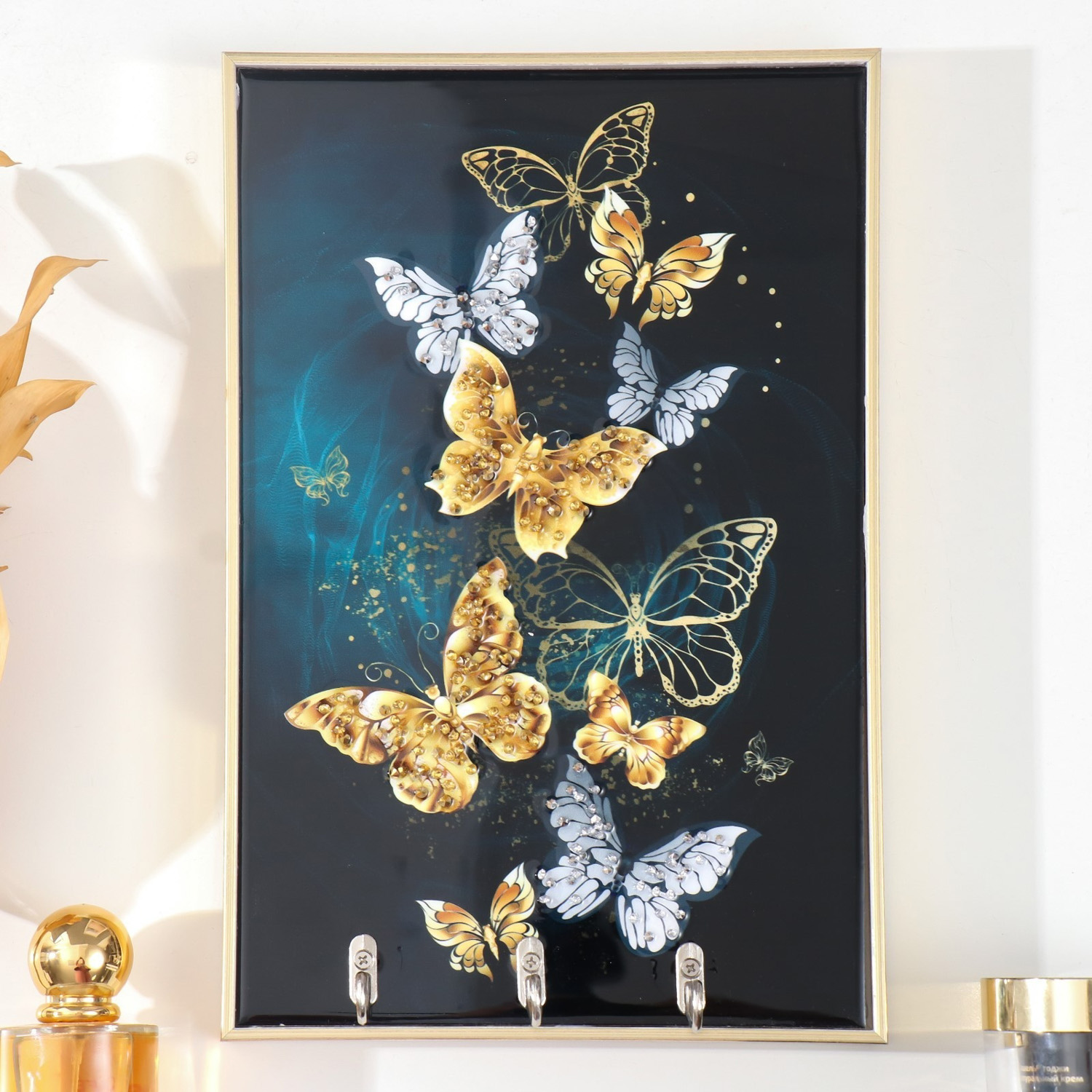 Ключница пластик, МДФ 3 крючка "Волшебные бабочки" стразы, золото 29х1,8х19 см   9398115