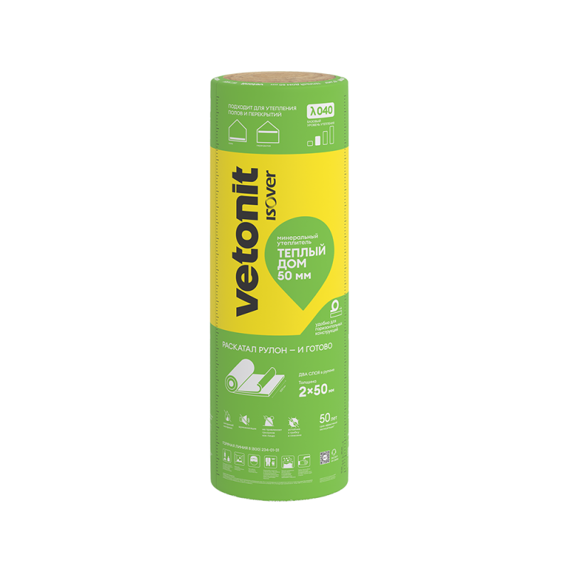 Vetonit (быв. Isover) Теплый дом мини Твин — тепло- и шумоизоляция в рулонах на основе кварцевого волокна базовой упругости, с теплопроводностью λ 0.040 для полов и перекрытий по лагам.