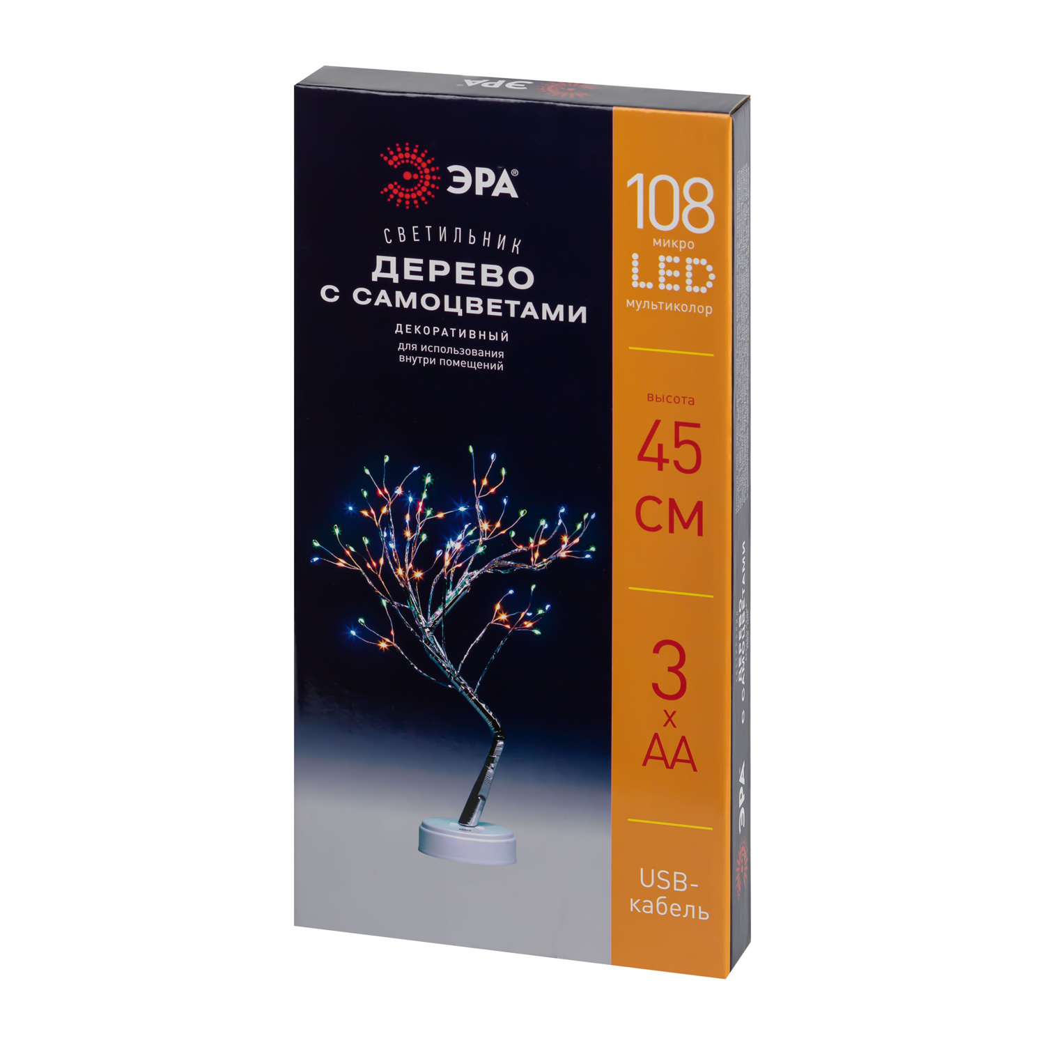 штСветодиодный декоративный светильник ЭРА «Дерево с самоцветами» с 36 миниатюрными светодиодами microLED – прекрасное решение для создания праздничной атмфосферы. Изделие можно использоваться как новогодний светильник, ночник, праздничный декор на стол и на полку для дома или офиса. Микросветодиоды – настоящий тренд в области декоративного освещения. Настольное светящееся дерево ЭРА высотой 45 см красиво светится разными цветами, microLED-лампочки украшают элегантные тонкие ветви с серебристым покрытием. Современный декоративный светильник ЭРА имеет сенсорное управление – удобная кнопка включения располагается на лаконичной подставке. Прибор может работать от 3 батареек АА и от USB-кабеля.