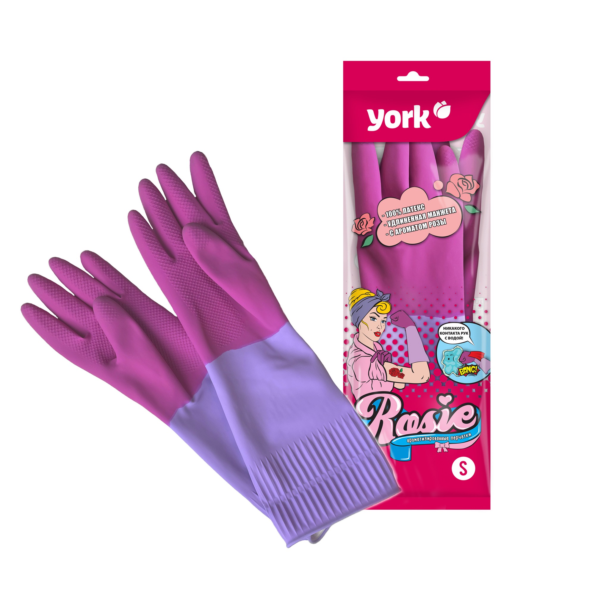 Перчатки латексные с хлопк.напыл. прочные Удлинненные Роз./Сир. 1пара р-р   "S" 092660 "York"*12/48