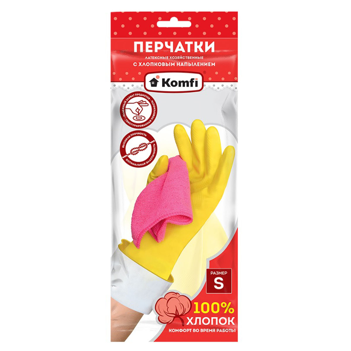 Хозяйственные латексные перчатки Komfi предназначены для защиты рук от мелких повреждений, грязи, краски и мыльных жидкостей. Сетчатая поверхность ладони и пальцев обеспечивает надежный захват скользких предметов и комфотрную работу с мыльными растворами.